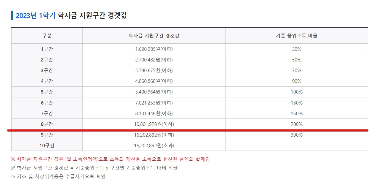 국가장학금은 학자금 1-10구간 중, 8구간 이하 대상자만 신청할 수 있습니다. 소득분위구간은 학생 가구의 소득과 재산 조사를 통해 월 소득 인정액을 계산하여 정해집니다. 학자금 지원구간 값은 '월 소득인정액'의 값이 적용되므로 본인이 속한 가구의 소득인정액을 알아보는 것이 필요합니다. 한국장학재단 웹사이트에서 소득인정액 모의계산을 해볼 수 있습니다.