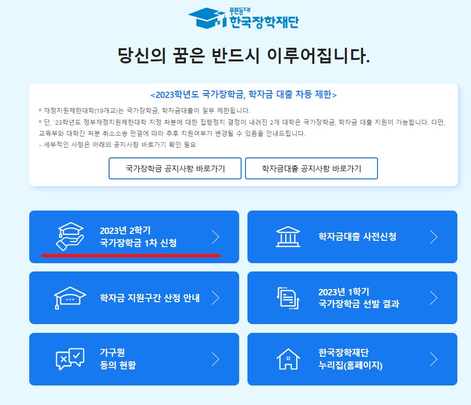 한국장학재단 홈페이지에 접속하시면 2023년 2학기 국가장학금 1차 신청 메뉴를 확인하실 수 있습니다.