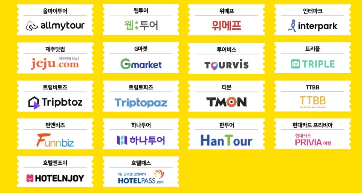 참여 숙박예약사이트명: 꿀스테이, 넥스투어, 노는법, 놀이의발견, 더현대트래블, 데일리호텔, 떠나요닷컴, 마이리얼트립, 스테이앤모어, 스테이폴리오, 11번가, 쏘카, 야놀자, 여기어때, 오늘밤엔, 옥션, 올마이투어. 웹투어, 위메프, 인터파크, 제주닷컴, G마켓, 투어비스, 트리플, 트립비토즈, 트립토파즈, 티몬, TTBB, 펀앤비즈, 하나투어, 한투어, 현대카드 프리비아, 호텔엔조이, 호텔패스