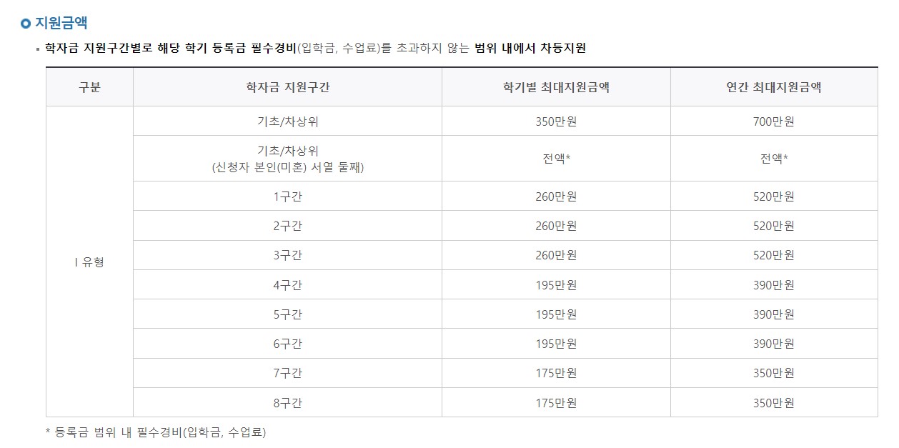 국가장학금 소득분위별 지급금액을 안내해 드리겠습니다. 지원금액은 앞서 설명드린 대로 소득분위 별로 차등하여 지급됩니다. 구간은 기초/차상위 ~ 8구간까지 나뉘며 아래 표처럼 학기별 최대 350만 원~ 연간 최대 700만 원까지 지원됩니다. 또한 기초/차상위 구간에 해당하는 학생 본인이 미혼이며 둘째인 경우, 입학금과 수업료를 포함한 등록금 범위 내에서 전액지원 되는 점 확인하시길 바랍니다.