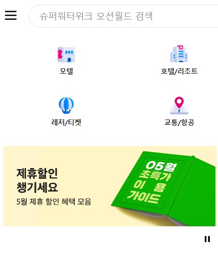 위에 소개된 숙박예약사이트 중 '야놀자'를 예로 들어 설명해 드리겠습니다. 야놀자 사이트에 들어가시면 배너에 5월 제휴할인 안내 배너가 있습니다.