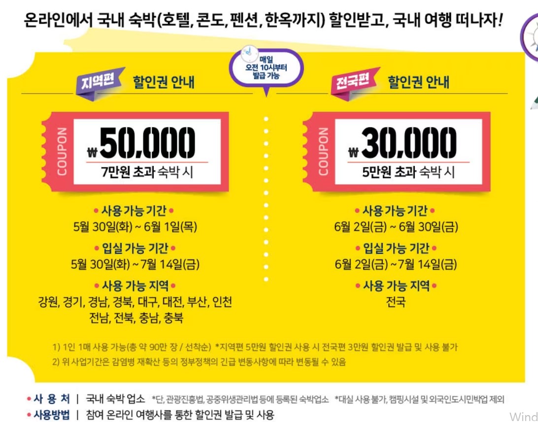 - 지역 편 숙박대전 할인권(5만 원)을 사용했다면 3만 원 할인권 발급 및 사용이 불가합니다.
