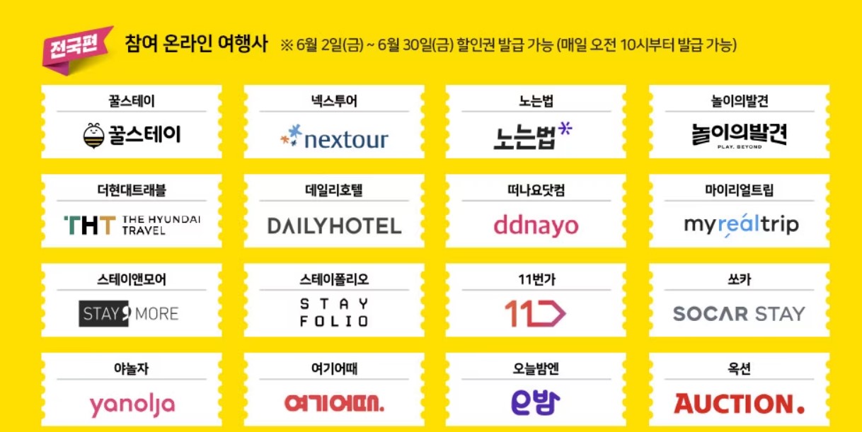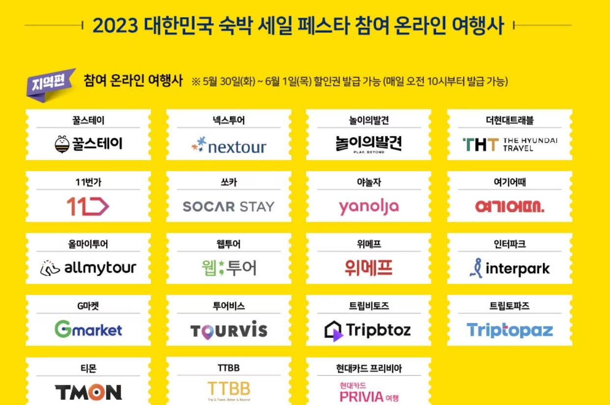 참여 숙박예약사이트명: 꿀스테이, 넥스투어, 노는법, 놀이의발견, 더현대트래블, 데일리호텔, 떠나요닷컴, 마이리얼트립, 스테이앤모어, 스테이폴리오, 11번가, 쏘카, 야놀자, 여기어때, 오늘밤엔, 옥션, 올마이투어. 웹투어, 위메프, 인터파크, 제주닷컴, G마켓, 투어비스, 트리플, 트립비토즈, 트립토파즈, 티몬, TTBB, 펀앤비즈, 하나투어, 한투어, 현대카드 프리비아, 호텔엔조이, 호텔패스